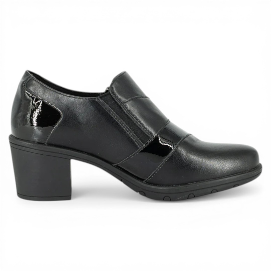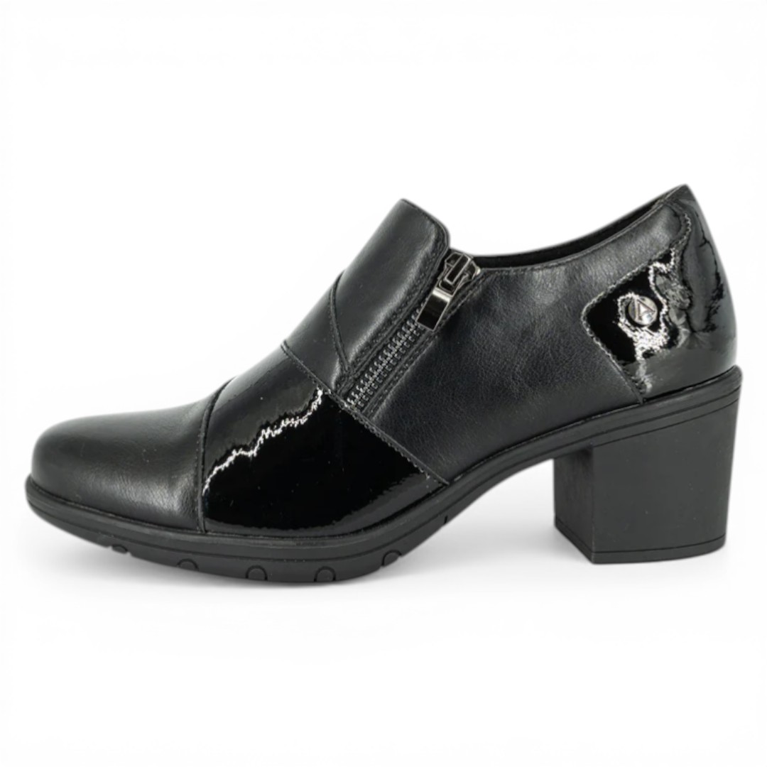 Fabricado en simil cuero de alta calidad, incorpora detalles en acabado brillante y texturizado que realzan el diseño. Su tacón de 6 cm brinda altura con estabilidad, mientras que el cierre lateral facilita el ajuste. El forro de microfibra suave y la suela de TPR antideslizante aseguran comodidad en cada paso.